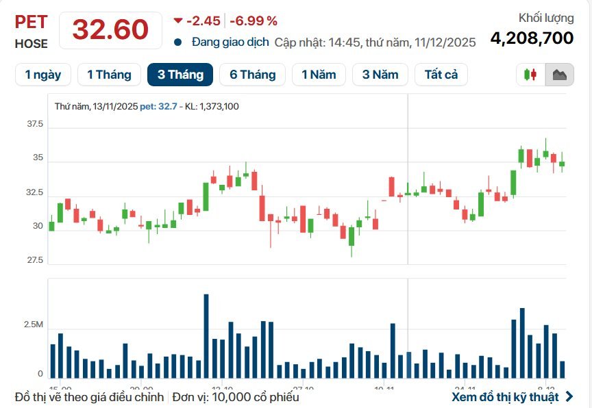 Diễn biến trên thị trường chứng khoán cùng ngày ghi nhận sự trái chiều đáng chú ý. Trong phiên giao dịch chiều 11/12, cổ phiếu PET chịu áp lực điều chỉnh mạnh, giảm sàn về mức 32.600 đồng/cp. Thanh khoản duy trì ở mức cao với hơn 4 triệu đơn vị được chuyển nhượng.