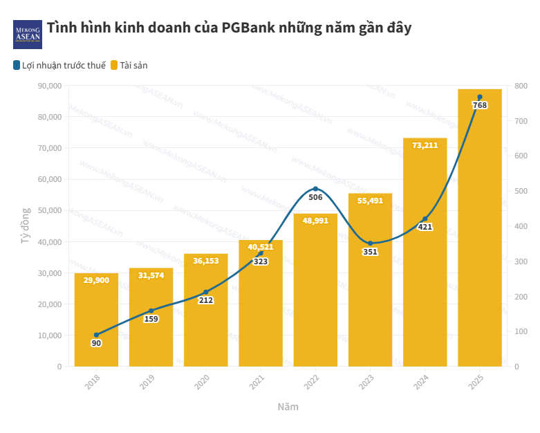 Lũy kế cả năm 2025, lợi nhuận trước thuế và sau thuế của PGBank lần lượt đạt 768 tỷ đồng và 615 tỷ đồng, tăng tương ứng 76,6% và 81% so với kết quả năm 2024, đồng thời phá sâu mức kỷ lục 506 tỷ đồng lãi trước thuế và 404 tỷ đồng lãi sau thuế của năm 2022.