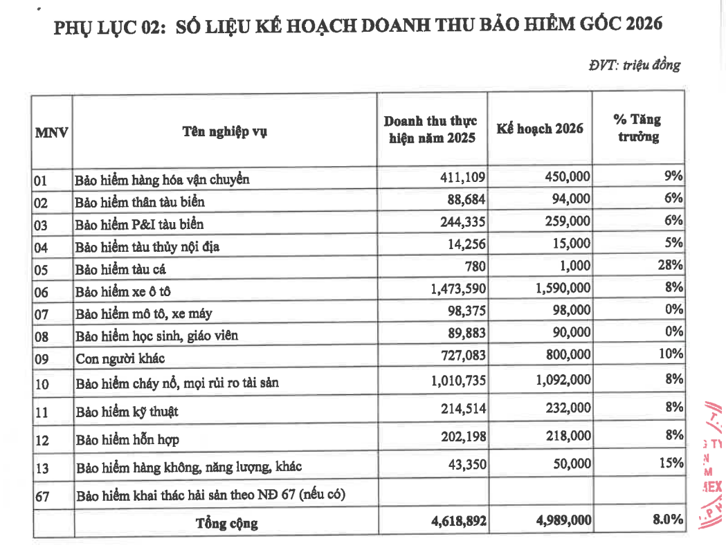 Trong đó, doanh thu phí bảo hiểm đạt 5.238 tỷ đồng, tăng trưởng 8% so với năm 2025 và phấn đấu đạt mức tăng 10%, gồm 4.989 tỷ đồng doanh thu bảo hiểm gốc và 249 tỷ đồng doanh thu nhận tái bảo hiểm.