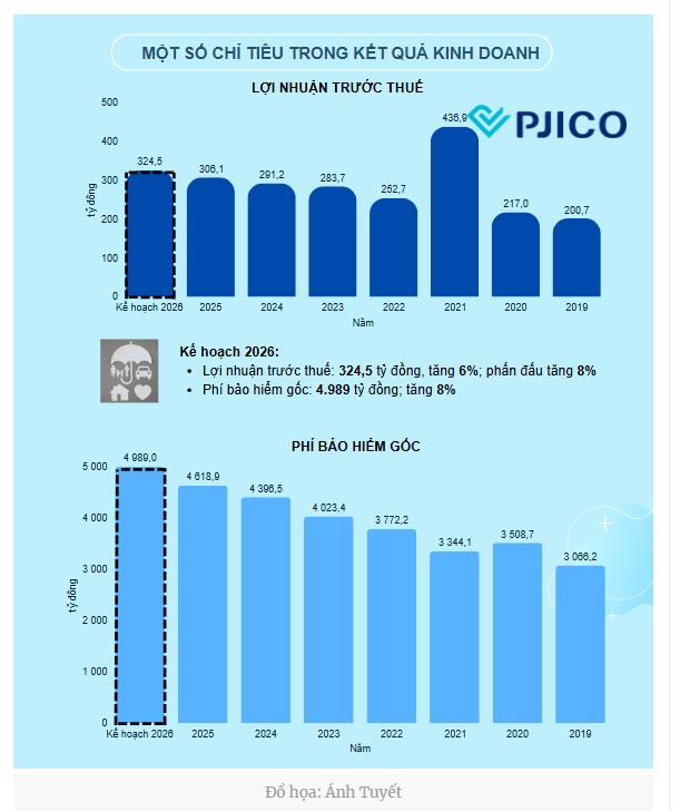 Dù chịu tác động từ thiên tai, cạnh tranh từ thị trường bảo hiểm phi nhân thọ và biến động nội bộ, PJICO vẫn hoàn thành vượt nhiều chỉ tiêu năm 2025. Bước sang 2026, PJICO đặt mục tiêu doanh thu phí bảo hiểm gốc đạt 4.989 tỷ đồng, tăng 8%; lợi nhuận 324,5 tỷ đồng và cổ tức dự kiến 12%, đồng thời kiện toàn Hội đồng quản trị.