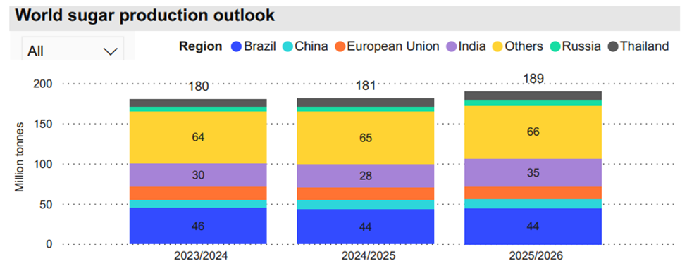 Nguyên nhân chính của xu hướng giảm giá này đến từ dự báo sản lượng toàn cầu sẽ vượt xa nhu cầu tiêu thụ. Dự kiến sản lượng đường thế giới cho niên vụ 2025/26 sẽ đạt 189,3 triệu tấn, tăng đáng kể so với con số 180,97 triệu tấn của niên vụ trước. Sự gia tăng sản lượng này chủ yếu đến từ sự phục hồi và duy trì sản xuất ở các quốc gia chủ chốt, tạo ra một áp lực giảm giá bền vững lên thị trường toàn cầu.