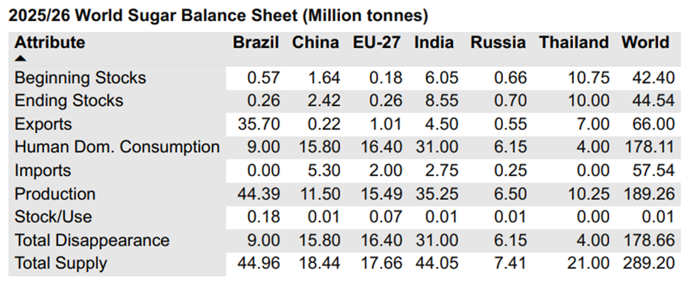 - Brazil: khẳng định vị thế là nhà sản xuất lớn nhất thế giới, brazil dự kiến đạt sản lượng 44,4 triệu tấn trong niên vụ 2025/26. Đáng chú ý, các nhà máy tại đây đang chủ động ưu tiên sản xuất đường thay vì ethanol (tỷ lệ pha trộn đường đạt 50,8%). Quyết định chiến lược này trực tiếp làm gia tăng nguồn cung dành cho xuất khẩu, tạo thêm áp lực giảm giá đáng kể lên thị trường thế giới.