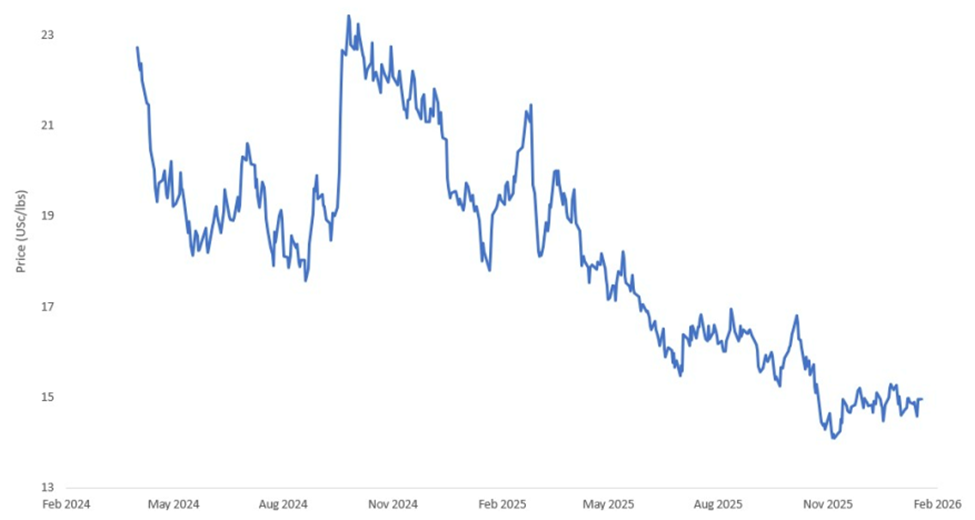 Diễn biến giá gần đây đã phản ánh rõ nét bối cảnh này. Hợp đồng tương lai đường thô trên sàn Newyork đã giảm xuống mức 14,74 us cent/lb vào ngày 21 tháng 1, tiếp tục xu hướng giảm giá đang thịnh hành. Tâm lý bi quan của thị trường được củng cố thêm bởi các vị thế bán khống của giới đầu cơ đã tăng lên mức rất cao, đạt 181.188 hợp đồng vào tuần kết thúc ngày 13 tháng 1, một trong những mức cao nhất trong chu kỳ hiện tại.