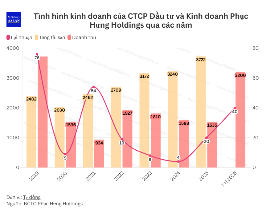 Tại đại hội, Phục Hưng Holdings trình cổ đông kế hoạch năm 2026 với doanh thu 3.200 tỷ đồng, gấp 2 lần mức thực hiện năm 2025; lợi nhuận sau thuế 40 tỷ đồng, tăng 92%; giá trị hợp đồng ký mới dự kiến 3.000 tỷ đồng, giảm 70% so với năm trước.