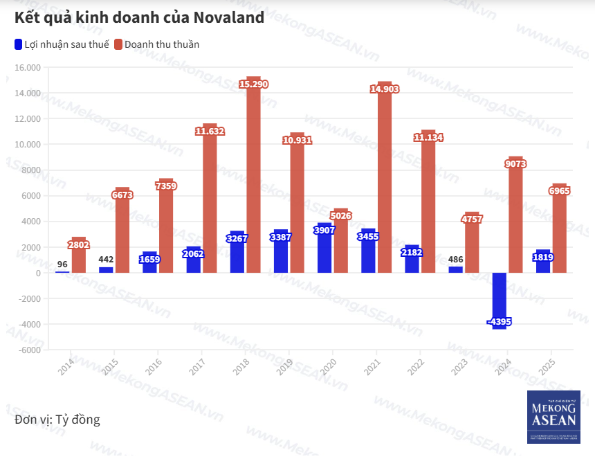 CTCP Tập đoàn Đầu tư Địa ốc No Va (Novaland, mã NVL) lãi sau thuế 1.819 tỷ đồng, so với năm 2024 lỗ gần 4.400 tỷ đồng. Trong đó riêng quý 4, công ty lãi sau thuế 3.638 tỷ đồng, so với mức lỗ gần 18 tỷ đồng của cùng kỳ năm trước (YoY).