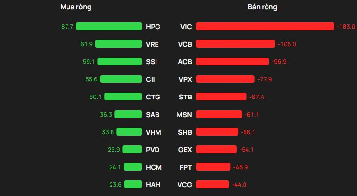 Chiều ngược lại, HPG dẫn đầu danh sách được mua ròng với giá trị khoảng 88 tỷ đồng. Đứng thứ hai là VRE, được khối ngoại giải ngân gần 62 tỷ đồng, theo sau là SSI với hơn 59 tỷ đồng. Hai mã CII và CTG cũng thu hút dòng vốn ngoại khi được mua ròng lần lượt 56 tỷ và 50 tỷ đồng.