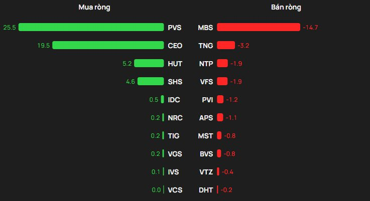 Chiều mua, PVS dẫn đầu khi thu hút dòng tiền ngoại lên tới khoảng 26 tỷ đồng. Xếp sau là CEO, được mua ròng gần 20 tỷ đồng, HUT và SHS cũng ghi nhận giá trị mua ròng khoảng 5 tỷ đồng.