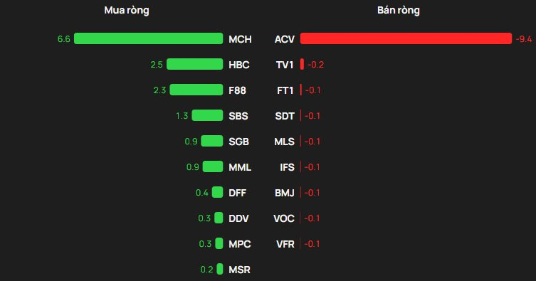 Trên UPCoM, khối ngoại mua ròng mạnh nhất tại MCH với giá trị khoảng 7 tỷ đồng. Theo sau là HBC và F88, cùng được mua ròng khoảng 2 tỷ đồng. Các mã SBS và SGB cũng ghi nhận lực mua ròng nhẹ từ khối ngoại.