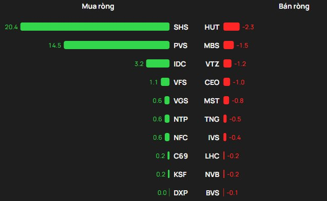 Ở chiều bán, HUT đứng đầu danh sách bị bán ròng với khoảng 2,3 tỷ đồng, theo sau là MBS với gần 1,5 tỷ đồng, VTZ với khoảng 1,2 tỷ đồng, CEO với khoảng 1 tỷ đồng và MST với khoảng 0,8 tỷ đồng.