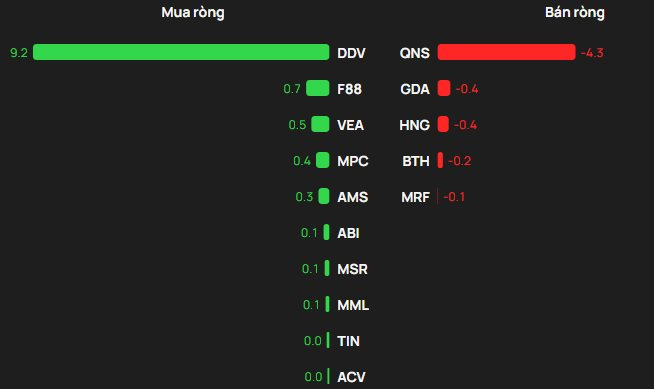 Chiều mua, khối ngoại mua ròng áp đảo tại DDV với khoảng 9 tỷ đồng. Các mã xếp sau gồm F88 với khoảng 0,7 tỷ đồng, VEA với 0,5 tỷ đồng, MPC với khoảng 0,4 tỷ đồng và AMS với khoảng 0,3 tỷ đồng.