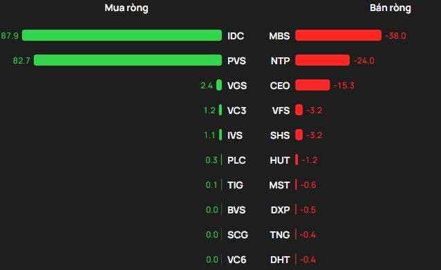 Tại chiều mua, dòng tiền ngoại ghi nhận lực “gom” áp đảo tại IDC (khoảng 88 tỷ đồng) và PVS (83 tỷ), bỏ xa phần còn lại; các vị trí tiếp theo trong top 5 mua ròng lần lượt là VGS (2 tỷ), VC3 (1 tỷ) và IVS (1 tỷ).