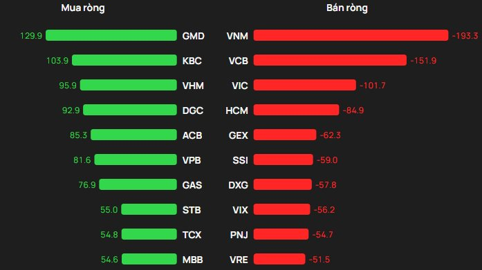 Chiều mua, khối ngoại mua ròng mạnh ở nhóm cổ phiếu dẫn dắt, với GMD đứng đầu (130 tỷ đồng), theo sau là KBC (104 tỷ), VHM (96 tỷ), DGC (93 tỷ) và ACB (85 tỷ).