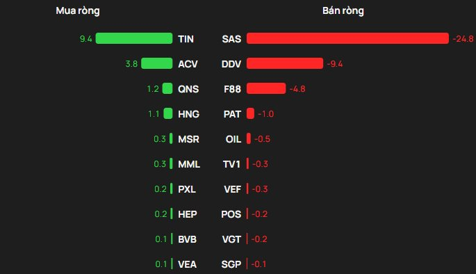 Ở chiều bán, SAS bị xả ròng lớn nhất (xấp xỉ 25 tỷ đồng), theo sau là DDV (9 tỷ), F88 (5 tỷ), PAT (1 tỷ) và OIL (dưới 1 tỷ).