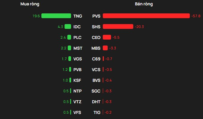 Ở chiều bán, PVS bị xả mạnh nhất với giá trị khoảng 58 tỷ đồng, kế đến là SHS (khoảng 20 tỷ), CEO (xấp xỉ 6 tỷ), MBS (3 tỷ) và C69 (1 tỷ đồng).