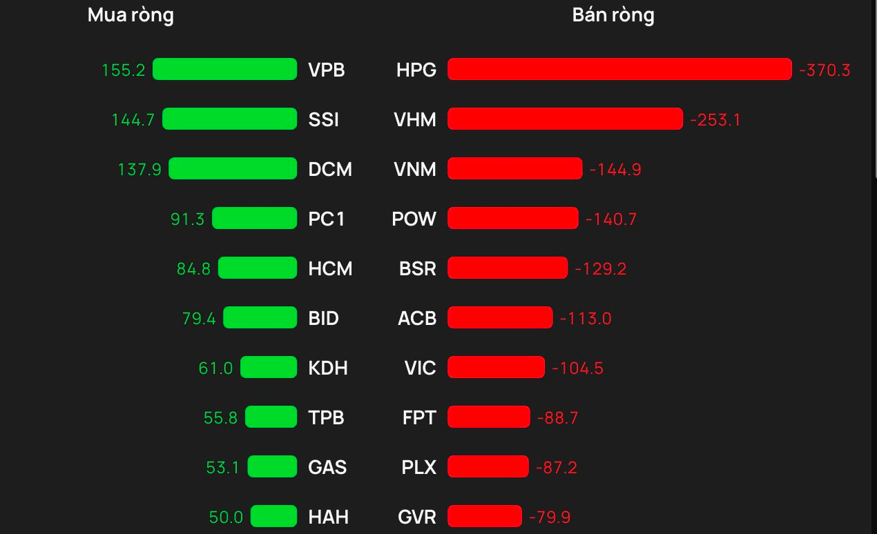 Ở chiều ngược lại, áp lực bán ròng dâng cao tại cổ phiếu HPG với giá trị lên tới hơn 370 tỷ đồng trong phiên hôm nay. Xếp tiếp theo, VHM cũng bị "xả" ròng khoảng 253 tỷ, theo sau là VNM (-145 tỷ), POW (-141 tỷ), BSR (-129 tỷ) và ACV (-113 tỷ đồng).