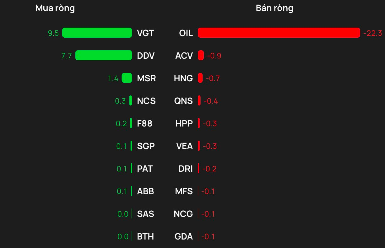 Chiều ngược lại, OIL bị xả khoảng 22 tỷ, theo sau ACV, HNG, QNS, HPP bị bán ròng mỗi mã vài trăm triệu.