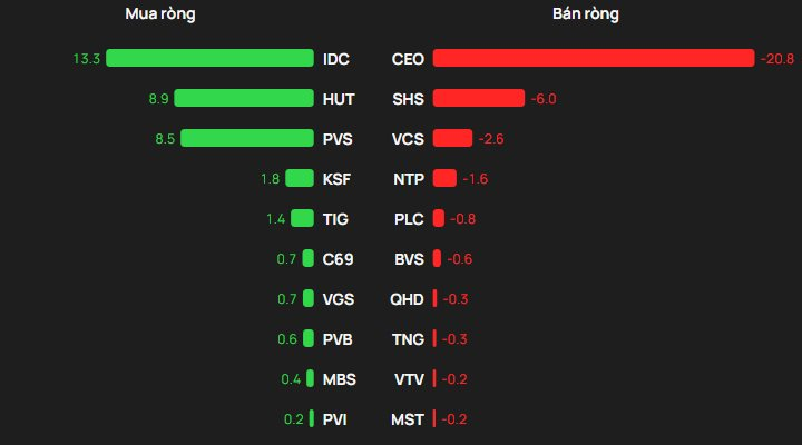 Chiều mua ghi nhận IDC là mã dẫn đầu với khoảng 13 tỷ đồng, theo sau là HUT (9 tỷ) và PVS (9 tỷ). Các mã KSF và TIG cũng có mức mua ròng đáng kể.
