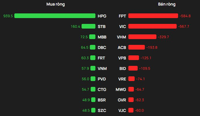 Ở chiều mua, cổ phiếu HPG dẫn đầu với mức mua ròng ấn tượng 940 tỷ đồng, theo sau là STB (160 tỷ) và MBB (73 tỷ). Các mã DBC (gần 65 tỷ) và FRT (60 tỷ) cũng được mua ròng đáng kể.