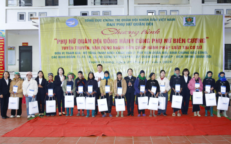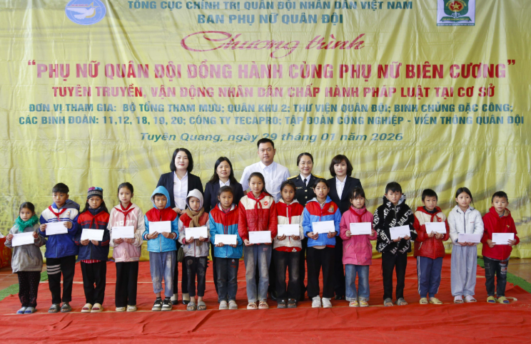 Cũng trong dịp này, Ban Phụ nữ Quân đội phối hợp với các đơn vị trong toàn quân tổ chức trao tặng 10 ngôi nhà mái ấm tình thương và hàng trăm phần quà ý nghĩa cho bà con và học sinh vùng biên giới tỉnh Tuyên Quang.
