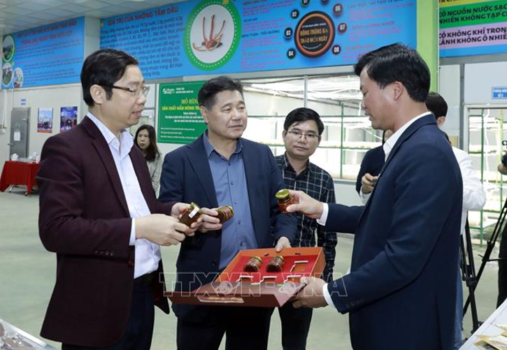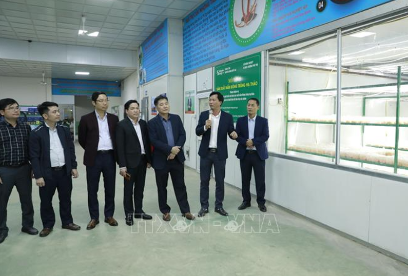Giám đốc Hợp tác xã nấm Tam Đảo Nguyễn Quốc Huy (thứ 2 từ phải sang) giới thiệu về mô hình nuôi cấy, sản xuất nấm Đông trùng hạ thảo tại Hợp tác xã nấm Tam Đảo. Ảnh: Nguyễn Thảo/TTXVN