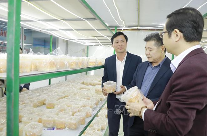Các đại biểu tìm hiểu về các sản phẩm đạt chứng nhận OCOP của Hợp tác xã nấm Tam Đảo. Ảnh: Nguyễn Thảo/TTXVN