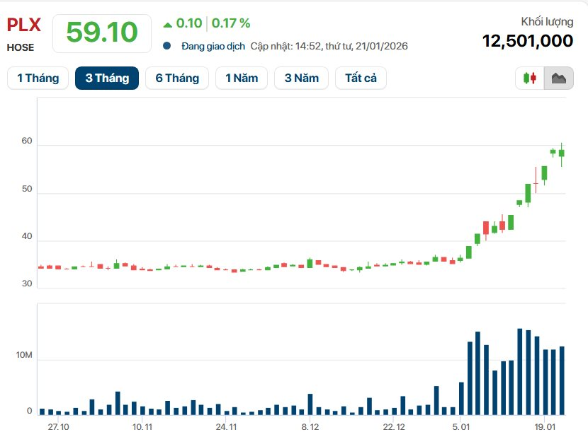 Sau chuỗi tăng điểm ấn tượng kể từ đầu tháng 1, thị giá PLX đã ghi nhận mức tăng trưởng gần 60%, đưa vốn hóa doanh nghiệp trở lại nhóm dẫn đầu sàn HoSE. Kết thúc phiên giao dịch ngày 21/1, cổ phiếu PLX đóng cửa tại mức 59.100 đồng/cp, tăng nhẹ 0,17% so với tham chiếu, tiếp tục giữ vững vùng đỉnh 4 năm với thanh khoản sôi động.