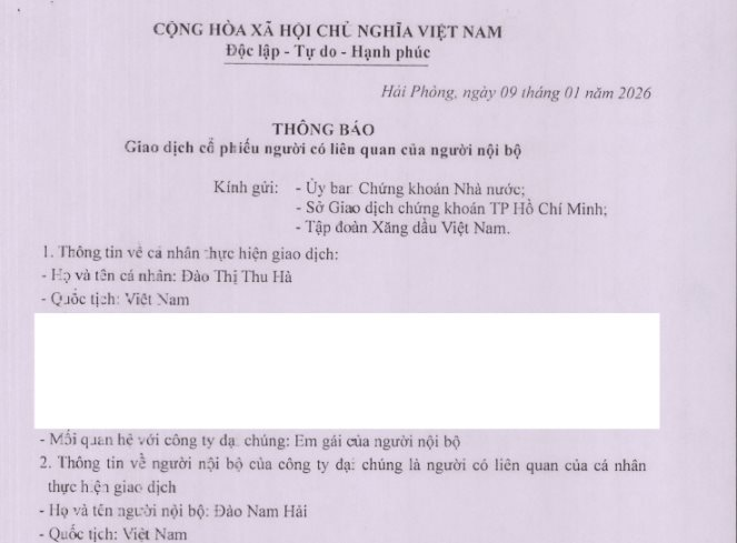 Trong bối cảnh cổ phiếu đang giao dịch ở vùng giá hấp dẫn nhất trong vòng 4 năm qua, bà Đào Thị Thu Hà, em gái ông Đào Nam Hải đăng ký bán toàn bộ 20.000 cổ phiếu PLX đang nắm giữ để phục vụ nhu cầu tài chính cá nhân. Giao dịch dự kiến được thực hiện từ ngày 21/01/2026 đến ngày 19/02/2026 theo phương thức khớp lệnh hoặc thỏa thuận. Nếu giao dịch thành công, bà Hà sẽ không còn nắm giữ cổ phiếu nào tại doanh nghiệp này.