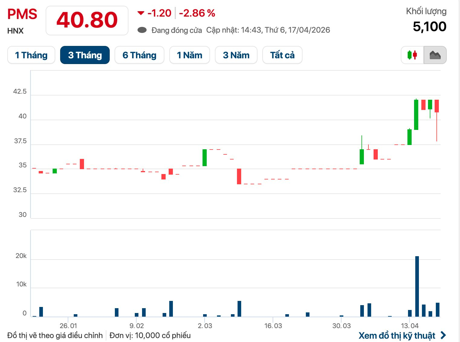 Trên thị trường chứng khoán, kết phiên 17/4, cổ phiếu PMS có giá là 40.800 đồng/cp. Vốn hoá thị trường đạt 293 tỷ đồng.