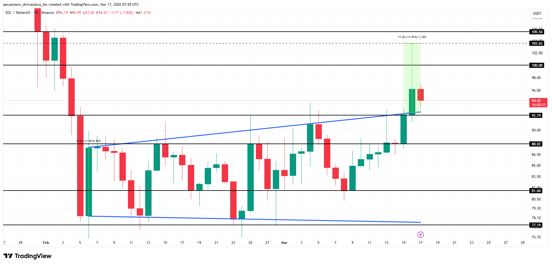 Solana hiện đang giao dịch quanh mức 94 USD, giữ vững trên vùng hỗ trợ 92 USD sau khi vượt ra khỏi mô hình chiếc loa lớn, dự báo khả năng tăng thêm 12% với mục tiêu lên 103 USD. Việc vượt qua mốc 92 USD là tín hiệu tích cực về mặt kỹ thuật, nhưng cần có thêm động lực để bứt phá. Giá cần vượt ngưỡng 100 USD để xác nhận mô hình và mở ra cơ hội hướng tới mức 103 USD hoặc 105 USD.