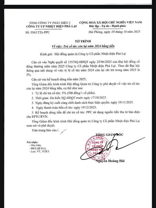 Công ty Cổ phần Nhiệt điện Phả Lại thông báo về việc trả cổ tức còn lại năm 2024 bằng tiền như sau: