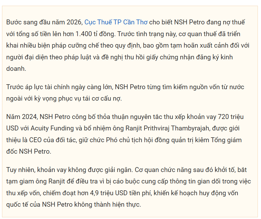 Lũy kế cả năm 2025, NSH Petro báo lỗ sau thuế 638 tỉ đồng. Khoản thua lỗ này khiến lỗ lũy kế của doanh nghiệp tăng lên 1.141 tỉ đồng, kéo theo vốn chủ sở hữu bị thu hẹp, chỉ còn khoảng 163 tỉ đồng tại thời điểm cuối năm.