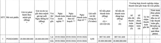 Theo đó, ngày 5/1/2026, Chứng khoán Dầu khí đã thực hiện thanh toán 20 tỷ đồng tiền gốc và gần 887,6 triệu đồng tiền lãi cho lô trái phiếu mã PSIH2426001, qua đó tất toán lô trái phiếu này đúng hạn.