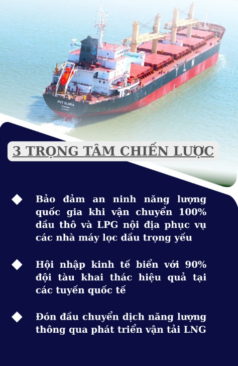 Không chỉ hướng đến mục tiêu kinh doanh, PVTrans còn xác định ba trọng tâm chiến lược: bảo đảm an ninh năng lượng quốc gia khi vận chuyển 100% dầu thô và LPG nội địa phục vụ các nhà máy lọc dầu trọng yếu; hội nhập kinh tế biển với 90% đội tàu khai thác hiệu quả tại các tuyến quốc tế, trong đó có những khu vực tiêu chuẩn khắt khe như Bắc Mỹ, châu Âu; và đón đầu chuyển dịch năng lượng thông qua phát triển vận tải LNG, đầu tư đội tàu Eco tiết kiệm nhiên liệu, giảm phát thải.
