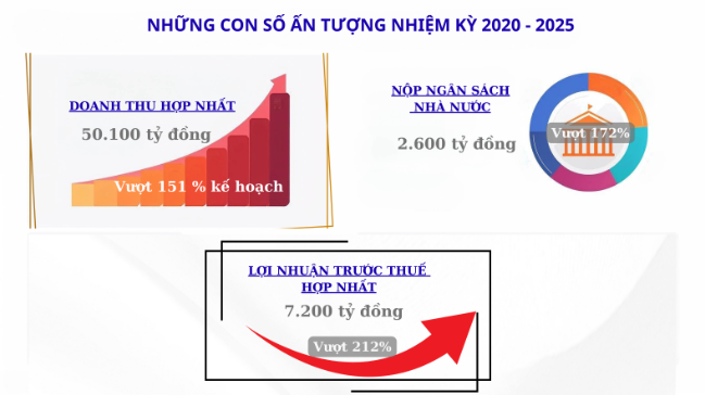 Kết quả nổi bật được thể hiện qua những con số ấn tượng: tổng doanh thu hợp nhất ước đạt 50.100 tỷ đồng, vượt 151 % kế hoạch, tăng trưởng bình quân 9%/năm; lợi nhuận trước thuế hợp nhất 7.200 tỷ đồng, vượt 212% chỉ tiêu; tỷ suất lợi nhuận sau thuế trên vốn điều lệ trung bình 33%, gấp hơn 2 lần so với nghị quyết Đại hội; nộp ngân sách nhà nước 2.600 tỷ đồng, vượt 172%.