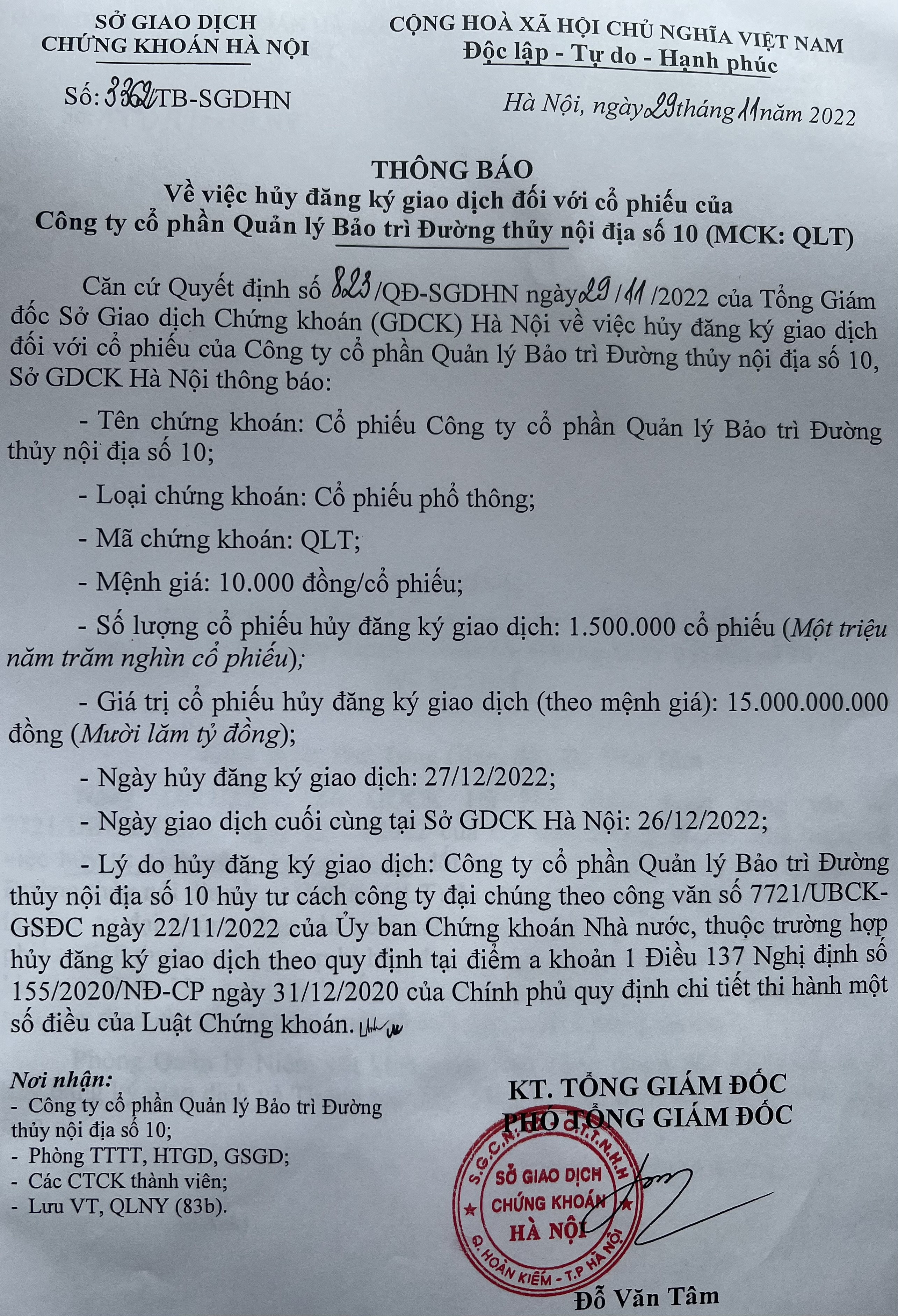 QLT: Ngày 27/12/2022, ngày hủy ĐKGD cổ phiếu của CTCP Quản lý Bảo trì Đường thủy nội địa số 10