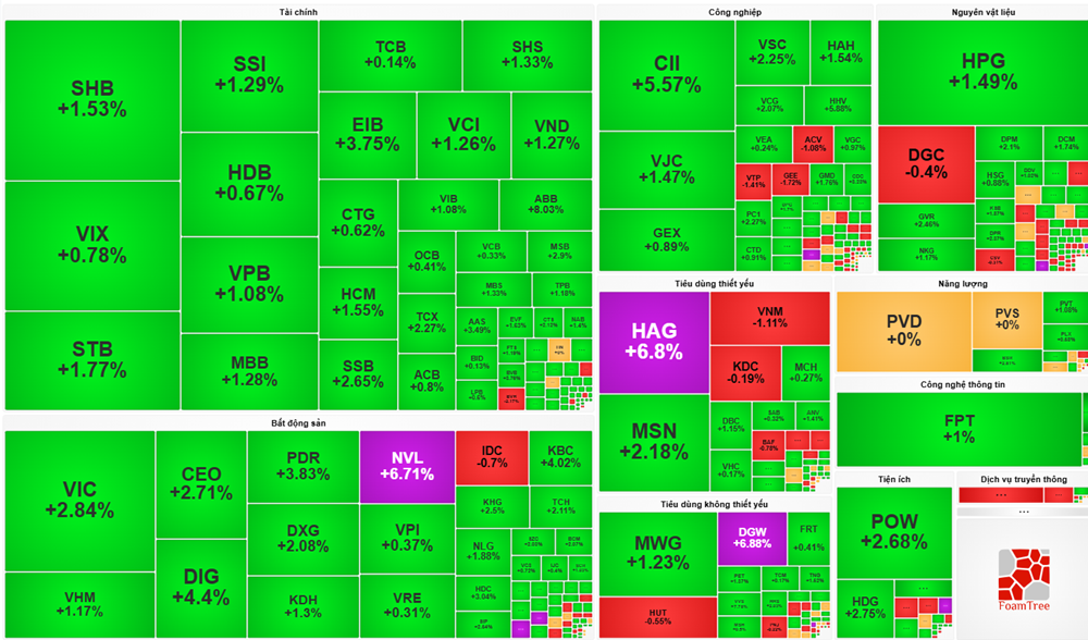 Bất động sản là nhóm gây chú ý nhất trong thị trường chứng khoán hôm nay khi sắc xanh phủ rộng toàn bộ nhóm ngành. Nhiều mã bật tăng mạnh như VIC (+2,84%), DIG (+4,40%), PDR (+3,83%), CEO (+2,71%), DXG (+2,08%). Đặc biệt, NVL trở thành tâm điểm khi tăng tới 6,71%, nằm trong nhóm tăng mạnh nhất sàn.