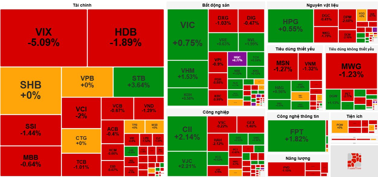 Trong khi, một số mã cổ phiếu vốn hóa lớn ngược dòng thị trường, tăng bứt phá, như: VJC +2,21%, CII +2,14%, FPT +1,82%, VHC +1,39%, DGW +1,13%, VPL +3,47%, …