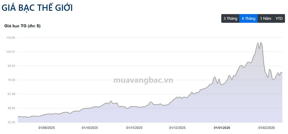 Cập nhật tới sáng 12/2, hiện giá bạc thế giới đang giao dịch ở mốc 83,8 USD/oz, tương ứng hồi phục gần 20% so với đáy cuối tuần trước.
