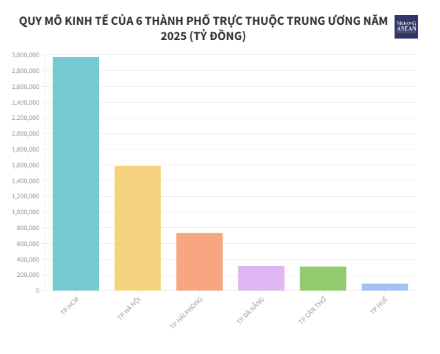 Tổng quy mô kinh tế của 6 thành phố trực thuộc trung ương đạt hơn 6 triệu tỷ đồng tại thời điểm cuối năm 2025. Dẫn đầu là TP HCM với quy mô kinh tế theo giá hiện hành đạt hơn 2,97 tỷ đồng.