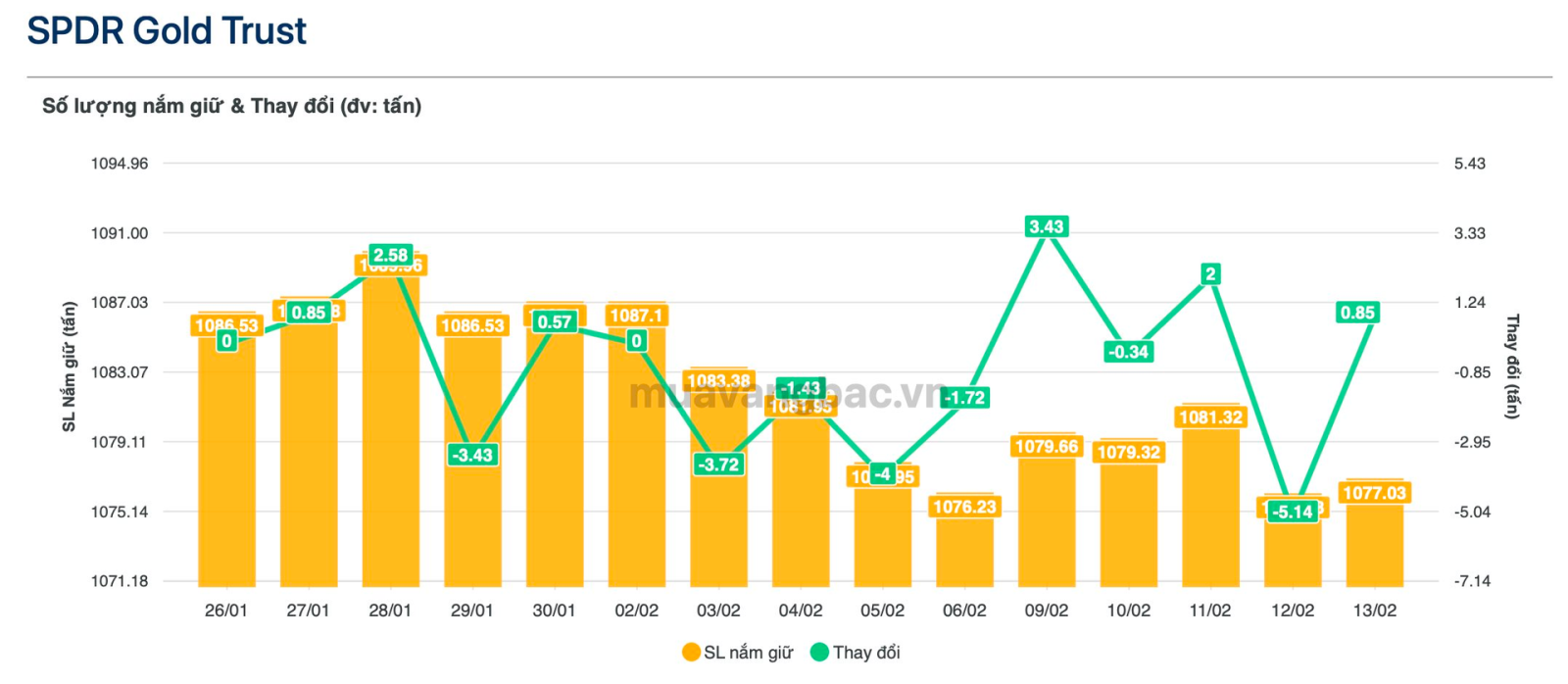 Tính đến ngày 13/2, SPDR đang nắm hơn 1.077 tấn vàng, tương ứng quy mô khoảng 173 tỷ USD.