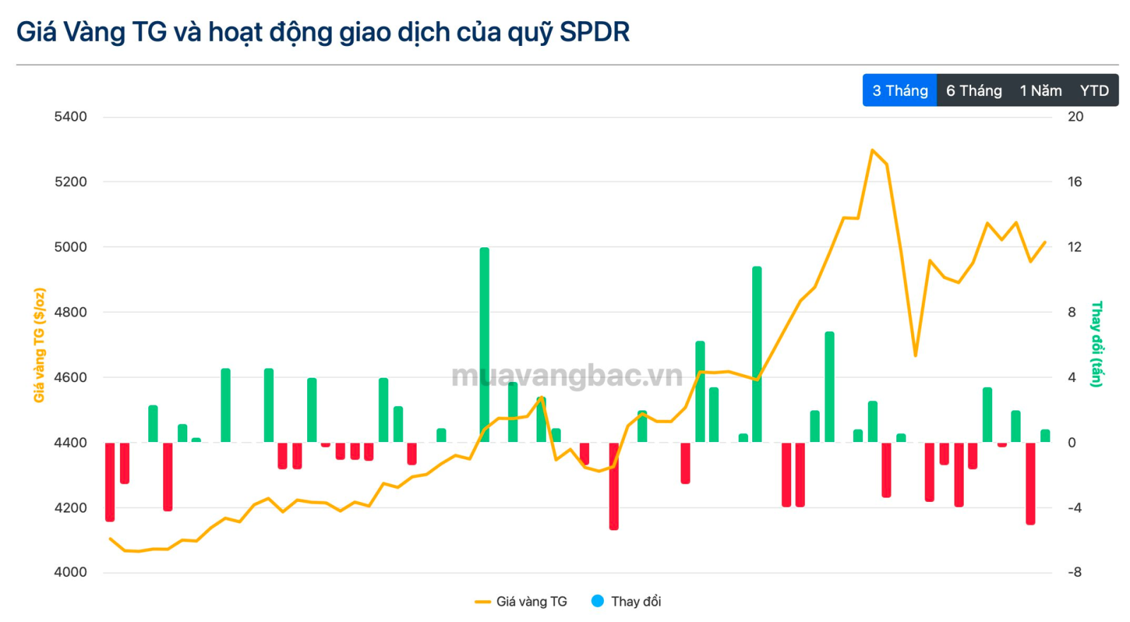 Xu hướng bán ra của SPDR diễn ra trong bối cảnh giá vàng thế giới có nhịp hồi phục khá mạnh từ đầu tháng 2 sau cú rơi lịch sử vào cuối tháng 1. Hiện tại, giá vàng đang giao dịch quanh mức 5.000 USD/oz, tăng gần 17% từ đầu năm nhưng vẫn thấp hơn khoảng 10% so với mức cao nhất từng chạm đến ghi nhận trong ngày 29/1 (trên 5.600 USD/oz).