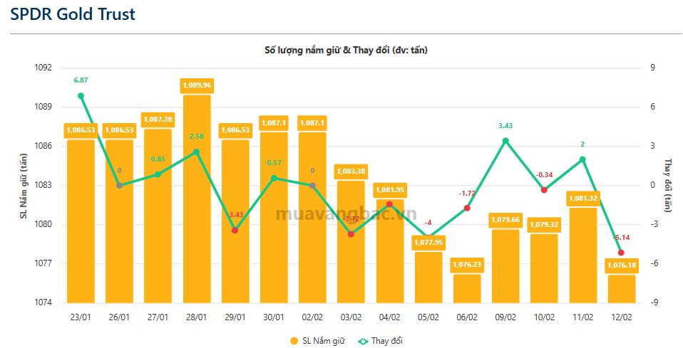 Theo cập nhật dữ liệu mới nhất từ muavangbac.vn, quỹ vàng lớn nhất thế giới SPDR Gold Trust vừa bán ròng 5,1 tấn vàng trong phiên 12/2, qua đó giảm khối lượng nắm giữ còn 1.076,2 tấn vàng. Trước đó, quỹ mua ròng tổng cộng gần 6 tấn vàng trong 3 phiên đầu tuần.