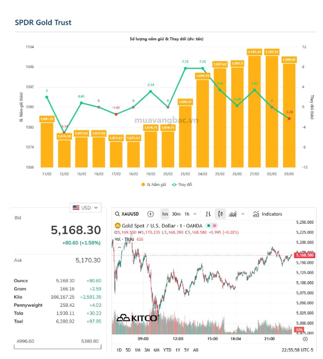 SPDR Gold Trust bán ra khi giá vàng thế giới giảm mạnh. Trong ngày 3/3, giá vàng từng vọt lên vùng đỉnh khoảng 5.370 USD/ounce nhưng sau đó nhanh chóng đảo chiều, giảm gần 360 USD để chạm đáy ngày ở 5.012 USD/ounce. Hiện tại, giá vàng đang nỗ lực hồi phục.