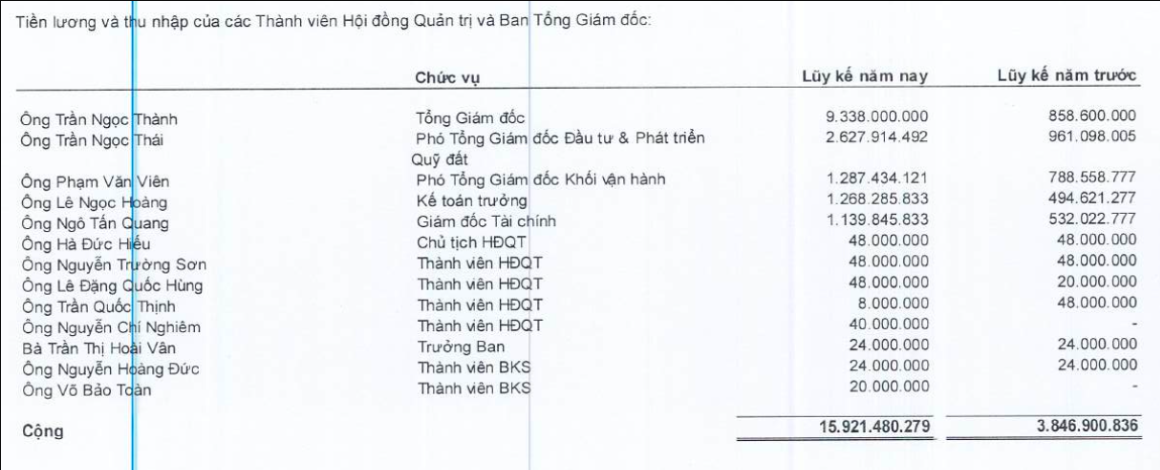 Trong đó, Tổng Giám đốc Trần Ngọc Thành nhận 9,34 tỷ đồng, tăng từ mức 0,86 tỷ đồng năm trước, tương ứng trung bình mỗi tháng vị lãnh đạo này có thu nhập gần 800 triệu đồng. Một số vị trí chủ chốt khác như Phó Tổng giám đốc và Kế toán trưởng cũng ghi nhận mức tăng thu nhập từ 2 đến 3 lần.