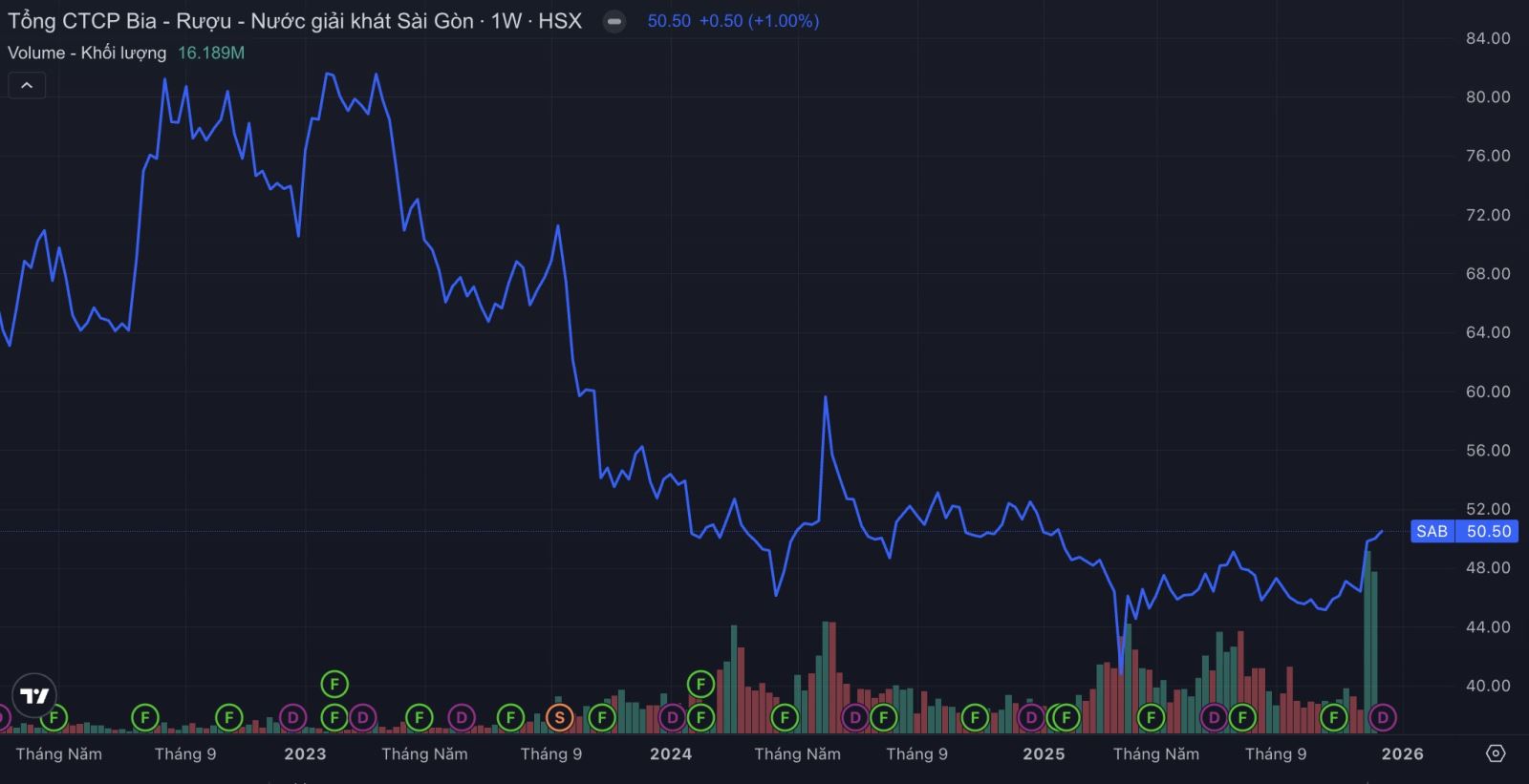 Diễn biến giá cổ phiếu SAB.