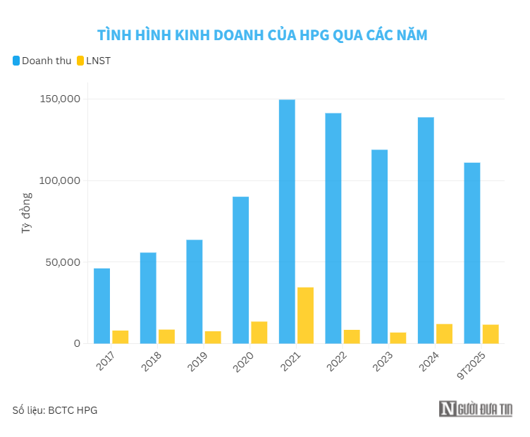 Lũy kế 9 tháng năm 2025, Hòa Phát đạt 111.031 tỷ đồng doanh thu, tăng 5%, và 11.626 tỷ đồng lợi nhuận sau thuế, tăng 26% so với cùng kỳ 2024. Với kết quả này, tập đoàn của tỷ phú Trần Đình Long đã hoàn thành 65% kế hoạch doanh thu (170.000 tỷ đồng) và 78% mục tiêu lợi nhuận (15.000 tỷ đồng) cả năm.
