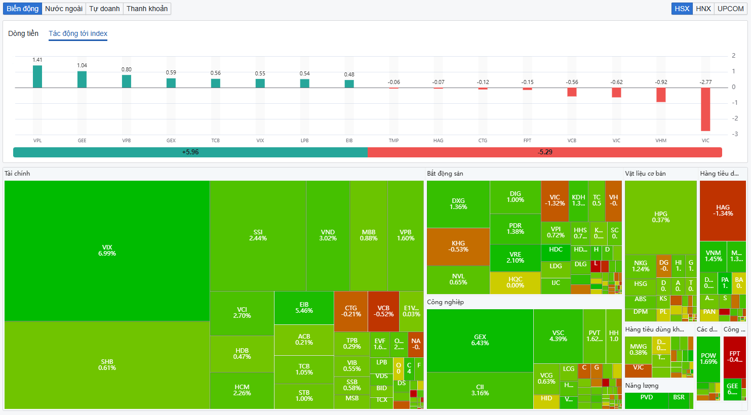 Nhóm tài chính và công nghiệp cũng ghi nhận nhiều điểm sáng: VIX tăng trần, SSI tăng 2,44%, VPB tăng 1,6%, SHS tăng 4,85%, VCI tăng 2,7%, VND tăng 3,02%; cùng GEX tăng 6,43%, CII tăng 3,16%, VSC tăng 4,39%, HAH tăng 2,16% và GEE tăng hết biên độ.