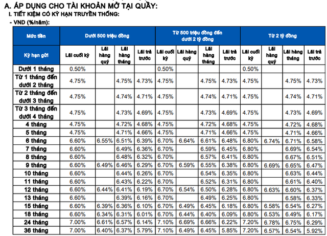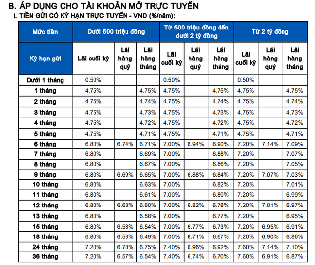 Với hình thức gửi tiền trực tuyến, lãi suất các kỳ hạn 1 – 5 tháng tiếp tục được giữ ổn định ở mức 4,75%/năm, không thay đổi so với biểu lãi suất trước đó.