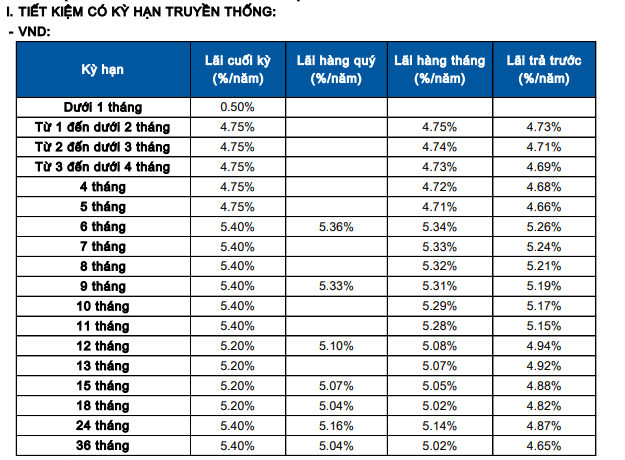 Đối với gửi tiết kiệm tại quầy, lãi suất kỳ hạn 24 tháng tăng 0,4 điểm % lên 5,4%/năm; trong khi lãi suất kỳ hạn 36 tháng cũng tăng 0,2 điểm % lên 5,4%/năm.