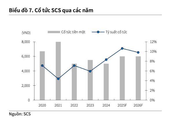 SCS luôn duy trì mức chi trả cổ tức tiền mặt cao trong những năm gần đây. Trong ĐHCĐ vào tháng 6 vừa qua, SCS đã thông qua đề xuất cổ tức 3.000 VND/cổ phiếu cho năm 2025.